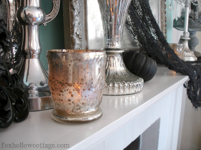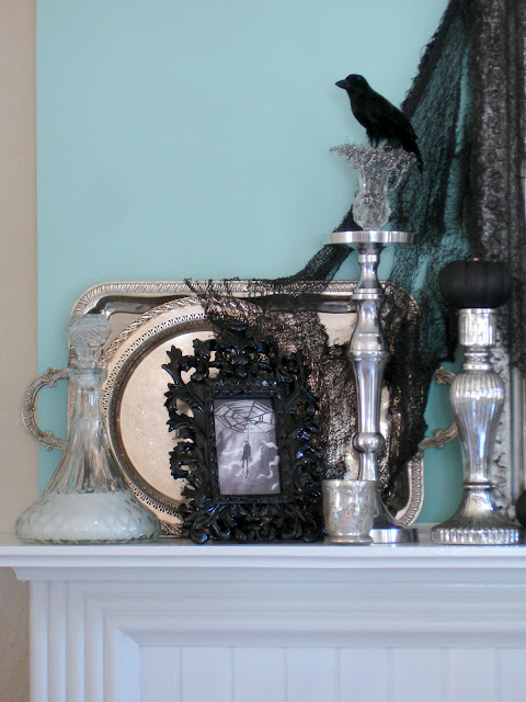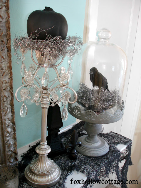 LOVE it, Shannon … you nailed it! And, I love how you layered silver trays, as well as mercury! (I have those same silver candlesticks, but in gold … just might have to paint)! And, the crow under your glass cloche looks awesome.
